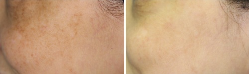 顔面のシミ(老人性色素斑+肝斑)をフラッシュ光線療法とレーザートーニングで治療いたしました。